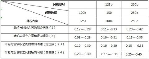 裝配間隙系20℃時(shí)的理論靜態(tài)間隙值。其能保證在額定工況下滿足動(dòng)態(tài)時(shí)所需之工作間隙。為此,裝配間隙乃是保證風(fēng)機(jī)性能和安全運(yùn)用的重要因素。每臺(tái)羅茨風(fēng)機(jī)出廠時(shí),皆已對(duì)裝配間隙進(jìn)行調(diào)整,用戶不得隨意變動(dòng)。具體間隙值見(jiàn)下表: